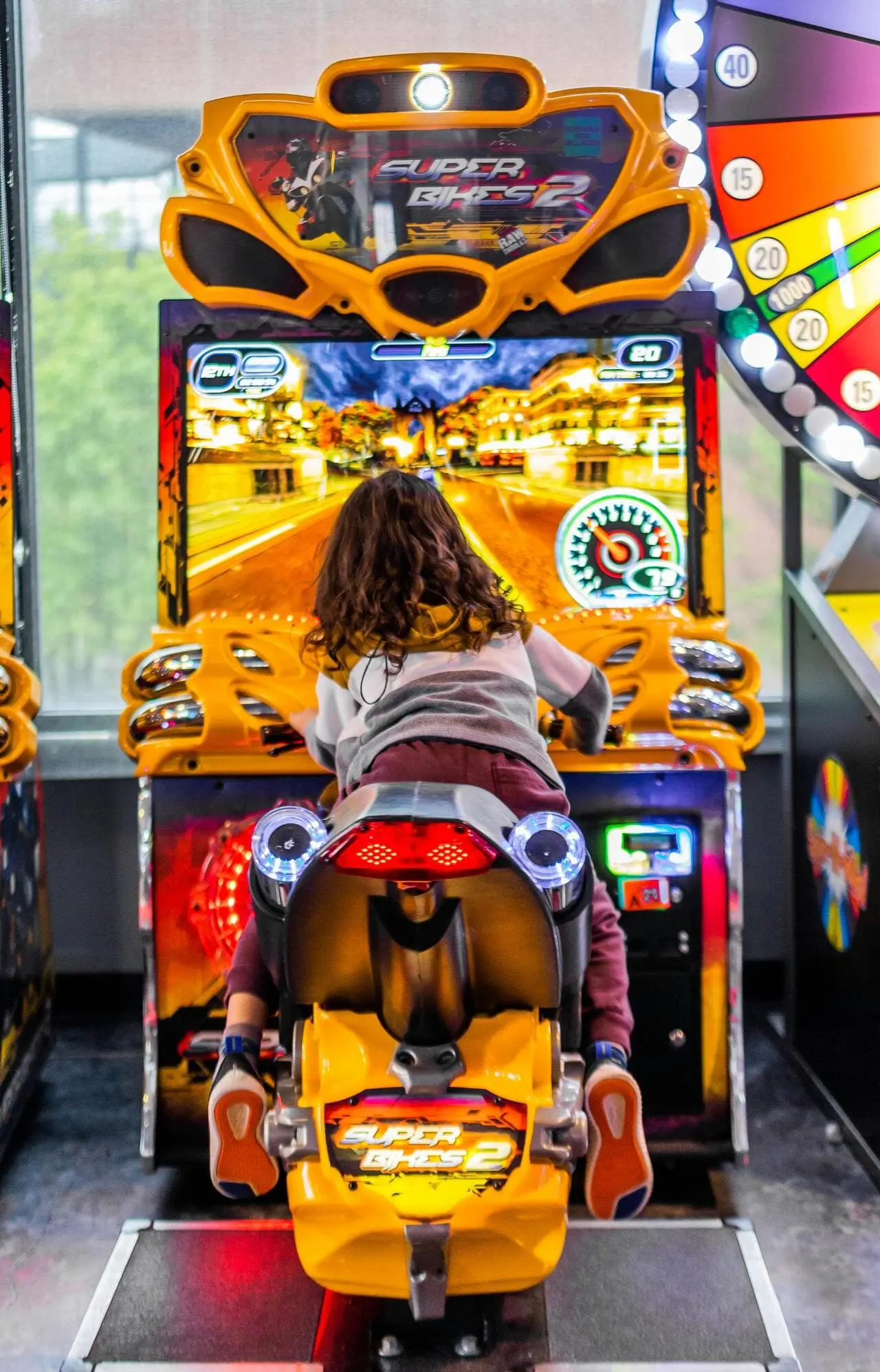 סימולטור אופנוע 4K לילדים הוא מתקן משחק חווייתי המדמה נסיעת אופנוע בצורה ריאליסטית ומלאת אקשן. לפי התמונה מדובר באופנוע ישיבה יציב עם מסך גדול מובנה, תאורת לד צבעונית ופלטפורמת דריכה, המותאם במיוחד לילדים. השחקן יושב על האופנוע, אוחז בכידון, ומכוון את הדמות במשחק באמצעות תנועות הגוף והטיית האופנוע בהתאם למסלול.